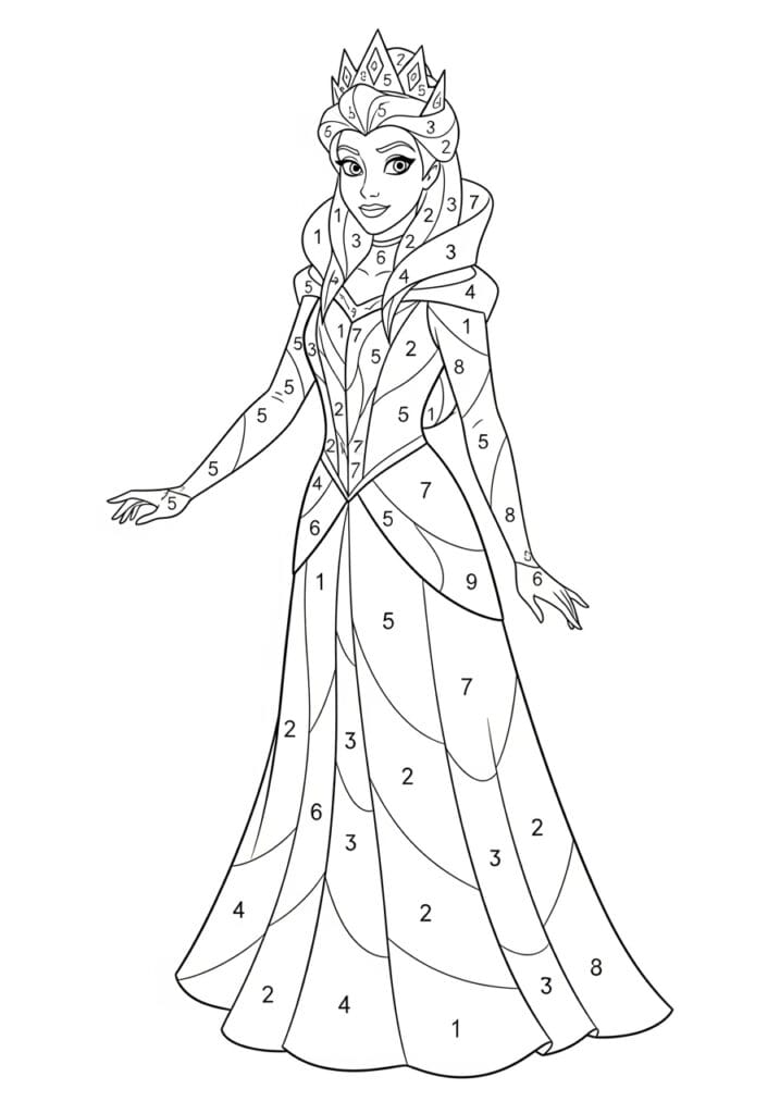This stunning color by number page features a regal ice queen standing tall in a dramatic full-length gown with a sharp pointed crown, a sweeping high-collared cape, and the kind of composed expression that says she is absolutely in charge and knows it. The overall silhouette is incredibly elegant, with the gown flaring out at the bottom into large sweeping panels divided by graceful curved lines that flow like wind-swept ice. The numbered sections run from 1 to 9 and are distributed beautifully across the entire design, with the lower skirt offering generous open sections perfect for bold color payoff while the bodice, cape, and hair have smaller more intricate zones that reward careful attention. The line work is clean and sophisticated throughout, giving this page a slightly more grown-up and refined feel compared to the rounder more cartoonish designs in the collection.