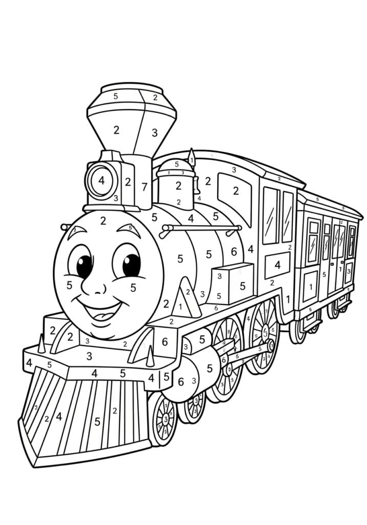 This charming color by number page features a classic steam locomotive coming toward you at a slight angle, complete with a tall chimney stack, a passenger carriage trailing behind, and an absolutely delightful smiley face built right into the front of the engine in true Thomas the Tank Engine style. The design is wonderfully detailed with spoked wheels, paneled carriage windows, riveted bodywork, and all the mechanical charm you’d expect from a vintage train, and all of it is divided into numbered sections running from 1 to 7. The sections vary really nicely in size, with the larger curved body panels of the engine offering generous open areas while the wheels, chimney, and carriage windows break things down into smaller more precise zones that keep your focus sharp. The line work is bold and well-structured throughout, giving the whole page a really satisfying mechanical tidiness.
