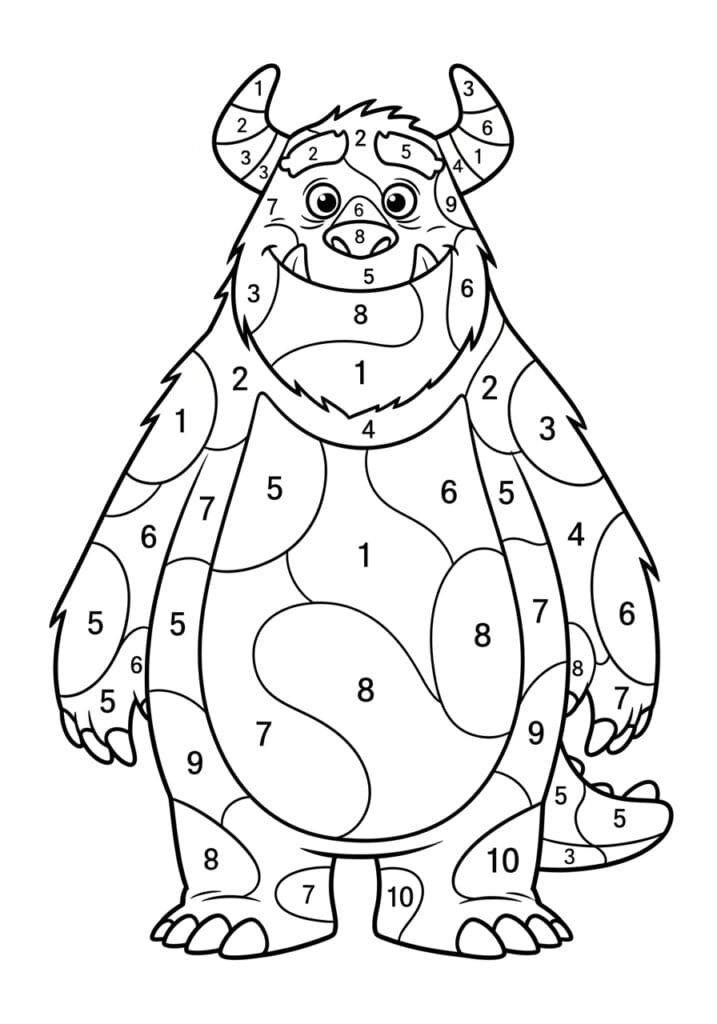 This lovably chunky color by number page features a big friendly monster standing front and center with two curved horns, a wide toothy grin, and a round fluffy body that radiates pure harmless goofiness despite technically being a monster. His entire body is covered in a gorgeous pattern of rounded blob-shaped spots of varying sizes that are scattered across his belly, arms, and legs, giving him a look that immediately brings Monsters Inc. vibes in the best possible way. The numbered sections run from 1 to 10 and follow both the spot pattern and the underlying body shapes, so you get a really interesting layered coloring experience where the spots and the base fur color work together to create depth. The line work is bold and clear throughout, with the shaggy fur edges along his arms and head adding a lovely textural contrast to the smooth rounded spot shapes covering his body.