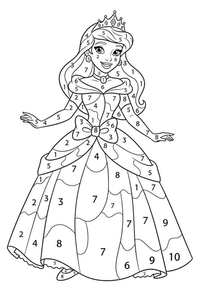 I personally find princess pages like this one incredibly relaxing because that big gorgeous skirt basically becomes a meditation session. You just pick up your color, follow the number, and watch the whole gown come to life section by section. The fact that this one goes up to number 10 means the finished result is going to be really rich and multi-toned, which makes it feel more rewarding than a simpler page. And honestly, coloring a princess in a tiara never gets old no matter how grown up you are.