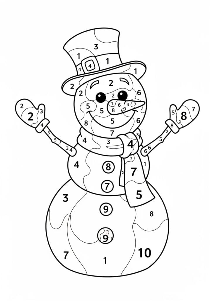 This jolly snowman color by number page is bursting with winter charm, featuring a classic three-ball snowman dressed up with a tall top hat, a cozy wrapped scarf, and a pair of chunky heart-shaped mittens on outstretched arms. The numbered sections go all the way from 1 to 10, and they’re spread across every part of the design in flowing organic shapes that give the snowman’s round body a really lovely textured look. The line work is bold and easy to follow, with the larger bottom and middle sections broken into generous sweeping zones while the face and hat have smaller more detailed sections that add a nice mix of scale throughout the page. Three big circled buttons run down his middle and his carrot nose gets its own little cluster of tiny numbered zones which is such a cute touch.