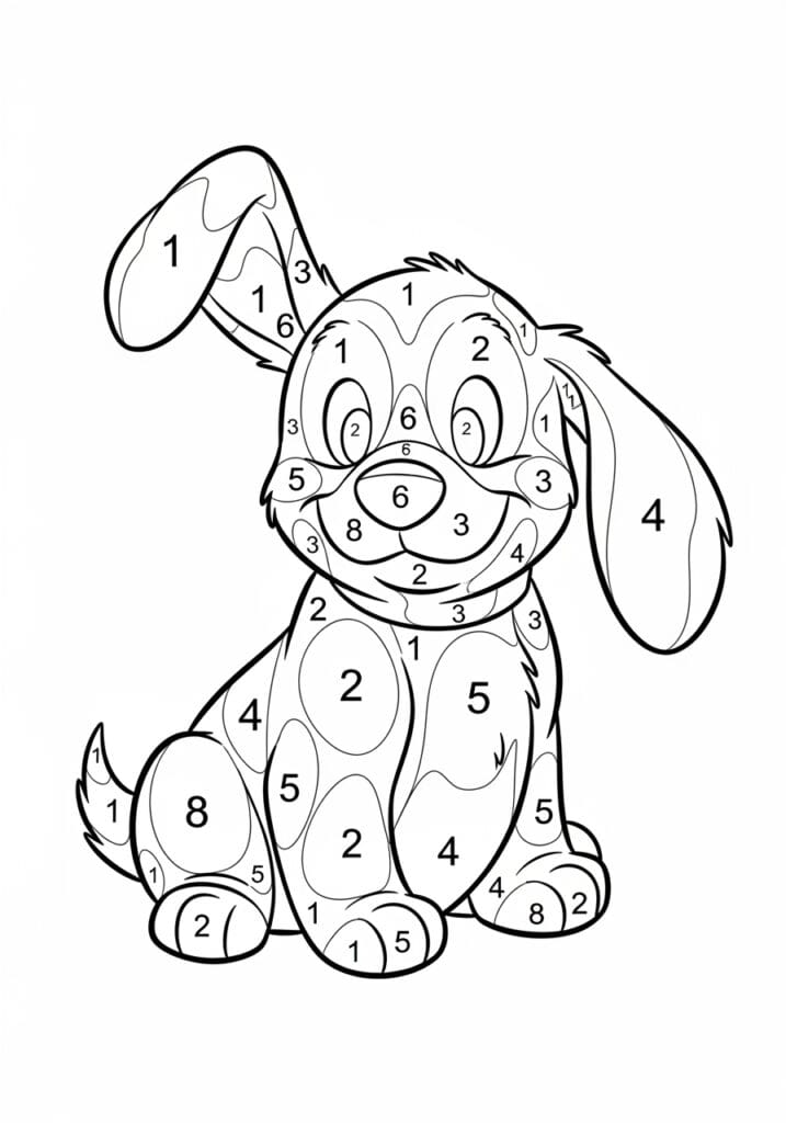 This utterly adorable color by number page features a chubby little puppy sitting up straight with the goofiest happiest expression on his face and two floppy ears flopping out on either side of his round head. One ear flips upward cheekily while the other hangs down long and relaxed, which gives him so much personality before you’ve even picked up a single pencil. The numbered sections run from 1 to 8 and are scattered across his body in a really interesting pattern of rounded oval shapes that almost look like spots, giving him a playful patchwork quality throughout. The line work is bold and clear everywhere, with the face area having lots of smaller detailed sections around his big eyes and oversized nose while the body opens up into larger more generous zones that are super easy to fill in.
