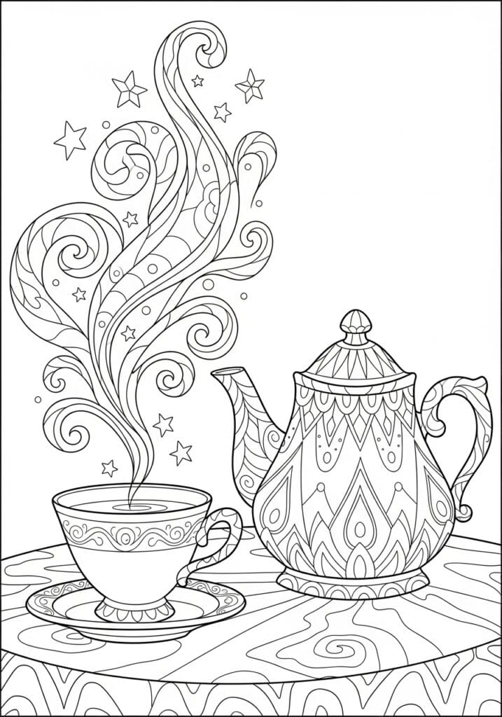 I find this page so relaxing because it has that perfect combination of detailed sections to really focus on and then looser flowing areas where you can just let your hand move freely. The teapot is my personal favorite part because all those layered geometric and floral patterns are just so satisfying to color one section at a time. I would love to try a warm golden yellow and cobalt blue combination on the teapot for a really rich jewel toned feel, with soft lavender and pink blended through the magical steam to make it look truly ethereal. It is a page that feels both cozy and a little bit whimsical at the same time, which is honestly my favorite combination.