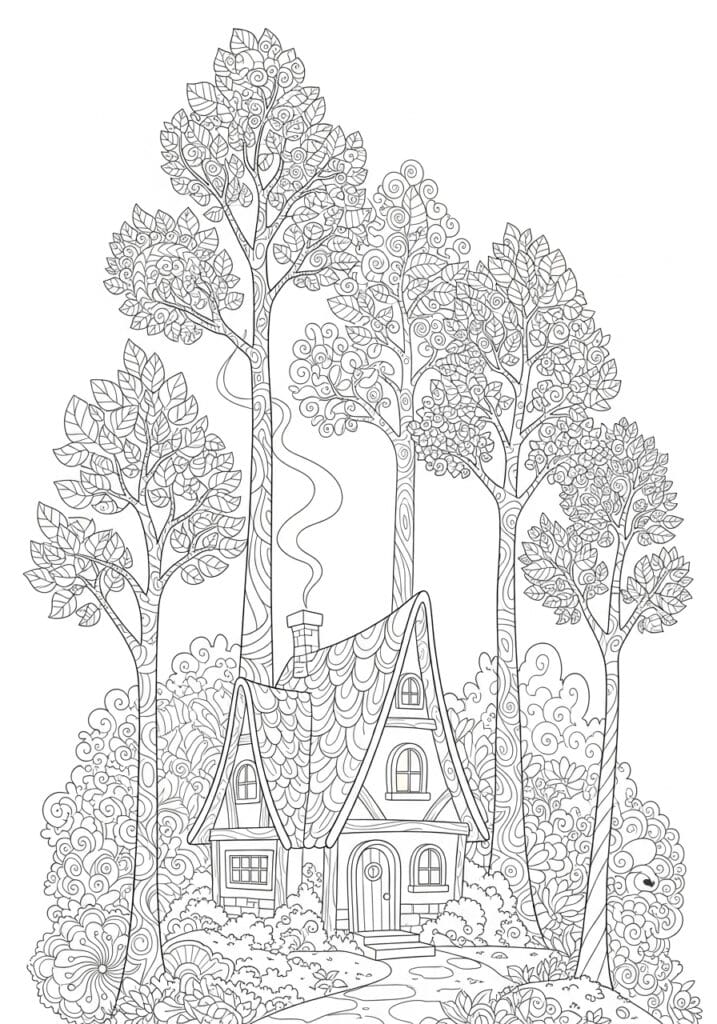 This is exactly the kind of page I reach for when I want to get completely lost in a coloring session without any pressure to make big bold decisions. The trees alone could honestly keep me busy for an entire evening and I mean that as the highest possible compliment. I would love to try an autumn palette on this one with warm burnt oranges and golden yellows in the treetops, deep mossy greens in the lower foliage, and a soft warm stone color on the cottage walls to make everything feel like a cozy October evening in a fairy tale village.