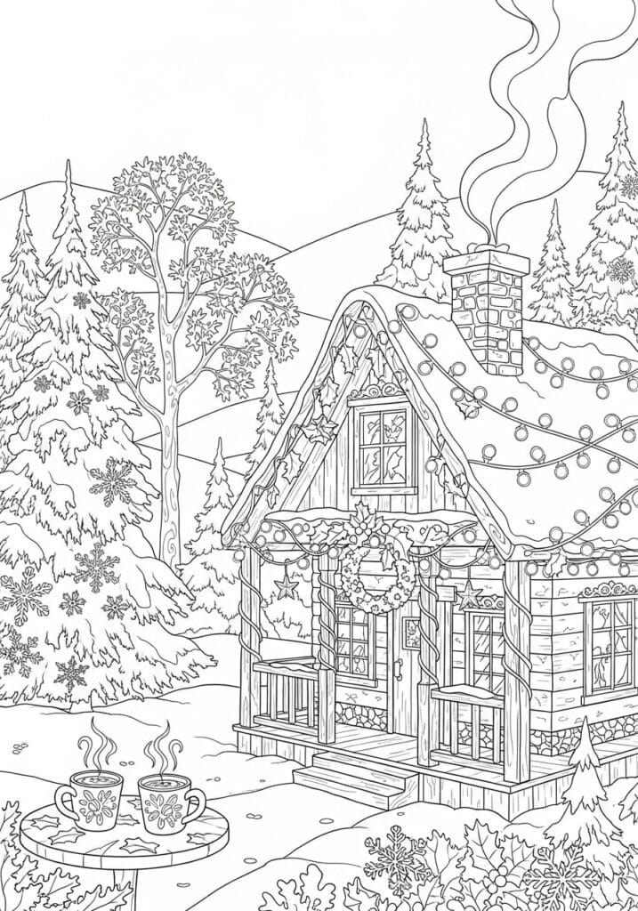 This page is the coziest winter scene I think I have ever seen on a coloring page and I genuinely want to live inside it. The centerpiece is the most charming snow laden cottage with a beautifully curved thatched style roof absolutely weighted down with thick snow, strung with two generous lines of round fairy lights that loop all the way across the roofline and around the front porch. A pretty holly wreath hangs on the front door, wooden steps lead up to a welcoming porch, and a brick chimney sends two lazy curls of smoke drifting up into the winter sky above. The whole cottage is nestled into a gorgeous winter landscape of snow covered pine trees and bare branched trees that fill the background with wonderful soft texture, and large detailed snowflakes are scattered throughout the snow drifts for the prettiest extra touch. In the lower left corner two steaming mugs sit on a little outdoor table, which is honestly the detail that sent me completely over the edge with how adorable this whole scene is. The line work is naturalistic and detailed throughout with lovely wood grain on the cottage, carefully drawn pine branches, and clean confident outlines on all the main elements.