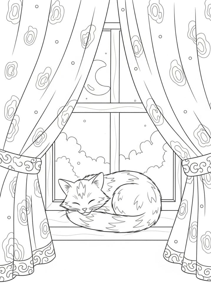 This page is so sweet and serene that I genuinely smiled the moment I saw it, and I think any cat lover is going to feel the exact same way. The star of the scene is a fluffy little kitten curled up completely content on a wooden window sill, eyes closed and tail tucked in that perfect round loaf shape that cats do when they are absolutely at peace with the world. Large flowing curtains frame the window on both sides, gathered with decorative tieback bands and covered in the most charming swirling cloud and scroll pattern that repeats all the way down the fabric. Through the window behind the sleeping cat you can see a beautiful night sky with a crescent moon peeking through soft billowy clouds and scattered dots of stars, giving the whole scene a really dreamy after hours atmosphere. The line work is clean and unfussy throughout, with bold curtain outlines, lovely soft fur texture on the kitten, and gently detailed pattern work on the fabric that is just detailed enough to be interesting without being stressful.