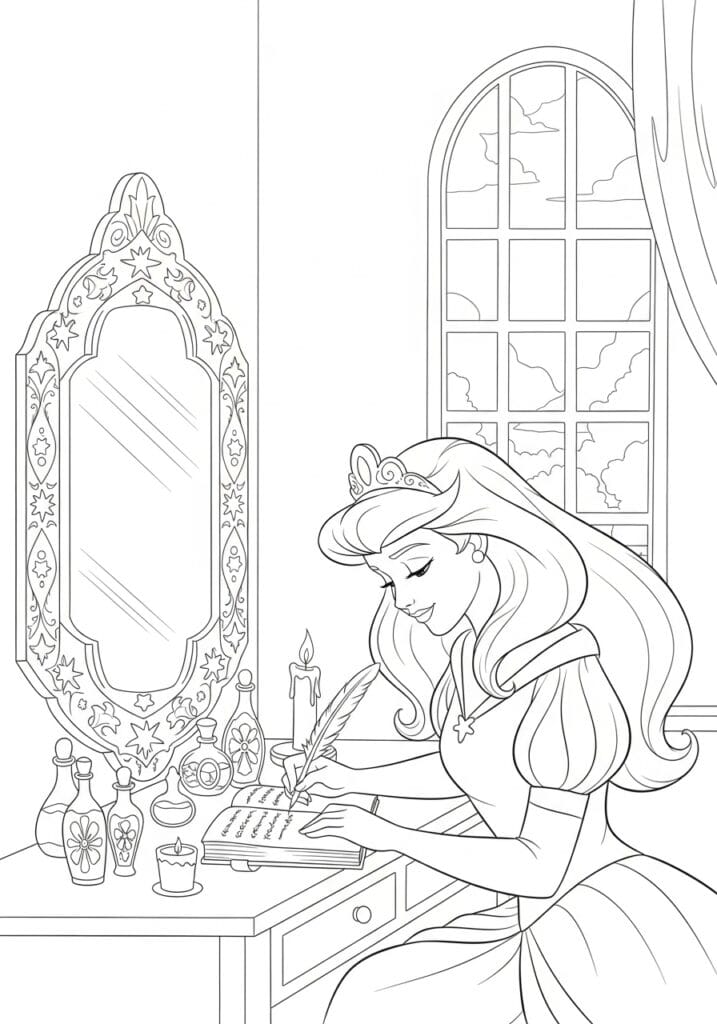 This page has the most enchanting evening atmosphere and I think it might be one of the most elegant designs in this whole collection. Princess Aurora is seated at a wooden vanity desk, writing in an open journal with a feather quill by the soft glow of a dripping candle, her long wavy hair cascading beautifully over her shoulder and her little tiara catching the light. The vanity surface is decorated with the sweetest collection of ornate perfume bottles in different shapes, each with delicate floral and scroll details etched into the glass. Behind her sits a stunning ornate mirror with a gorgeous gothic inspired frame packed with stars, crescent moons, flowers, and twisting vine details that honestly deserves its own coloring page entirely. A large arched window on the right shows a moody night sky with dramatic clouds rolling through the panes, and a soft curtain drapes elegantly to one side. The line work has that beautiful clean classic Disney illustration quality throughout, with smooth confident character lines and just enough decorative detail in the mirror frame and perfume bottles to keep things really interesting.
