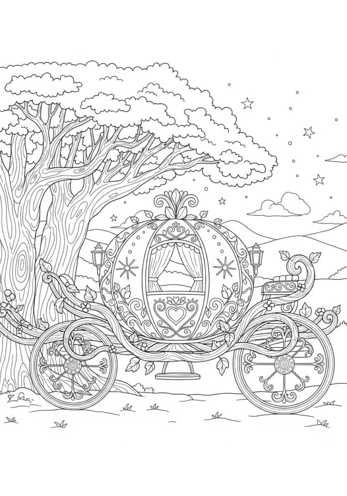 I love this page because it has such a different mood to it compared to a typical castle or ballroom scene, and that open countryside starlit setting makes it feel genuinely romantic and a little bit cinematic. The ancient tree on the left is where I would spend a serious amount of happy time, layering warm browns and deep rusts through all those beautiful wood grain rings. For the carriage I am thinking a soft sage green with gold accents to give it an enchanted garden feel rather than the classic orange, which I think would look absolutely stunning against that twilight sky done in soft dusty blues and purples.