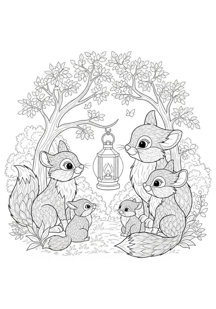 I think this page is perfect for anyone who wants a coloring session that just feels genuinely heartwarming from start to finish. The fur texture on each fox is my favorite part to color because those layered marks respond so beautifully to blending, and I can already picture the two adults in deep russet orange with the little cubs in a softer sandy tone. The hanging lantern glowing warm amber in the center of the page would be such a gorgeous focal point, and I would keep the surrounding foliage in soft natural greens to let that cozy lantern light really shine through the whole scene.
