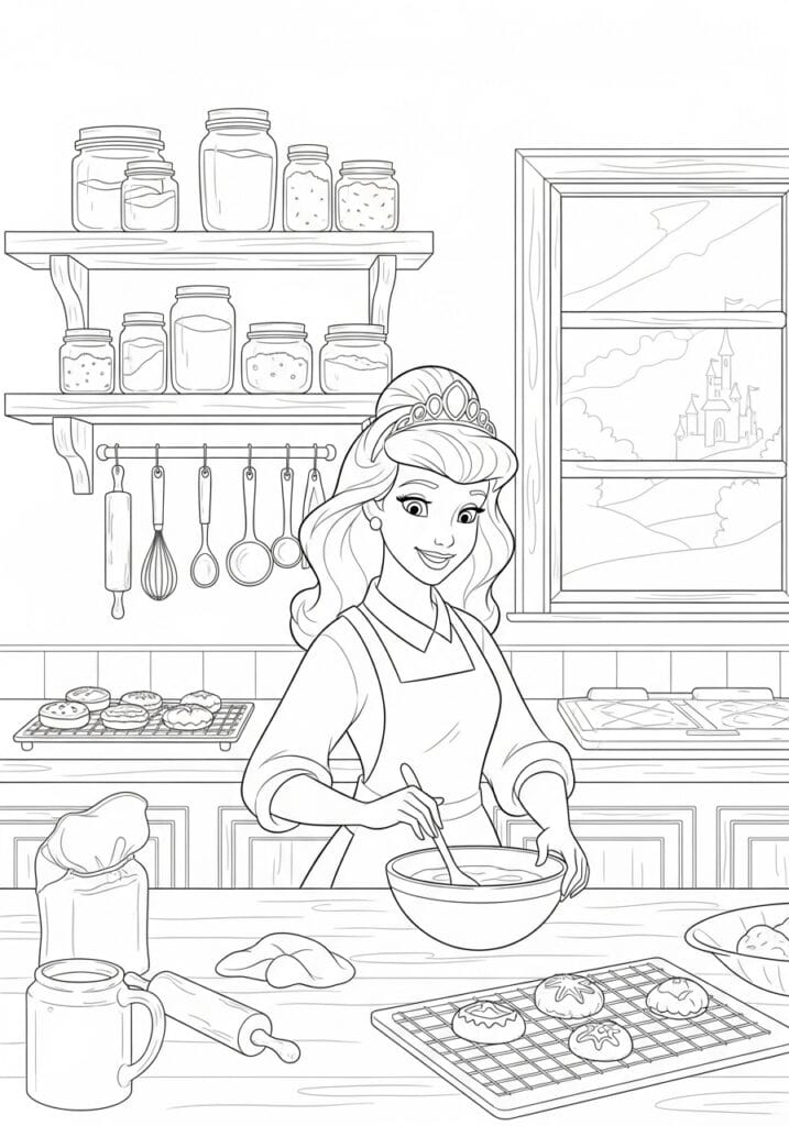 This page is such a fun and unexpected take on a Disney princess scene and honestly it might be my favorite kind of coloring page there is, one that shows a princess just doing something totally normal and joyful. Cinderella stands at a kitchen counter wearing an apron over her dress and a little tiara still sitting perfectly in her upswept hair, happily stirring a mixing bowl with the biggest smile on her face. The kitchen around her is wonderfully detailed and homey, with two wooden shelves lined with a lovely collection of mason jars and pantry staples above her head, and a row of kitchen utensils including a whisk, rolling pin, and various spoons hanging neatly from hooks along the backsplash. Freshly baked goods sit cooling on wire racks both behind her and on the counter in front, and a rolling pin and more baking supplies are scattered across the worktop in that perfectly lived in way. Through the window on the right a fairy tale castle sits in the misty distance, which is just the most delightful little reminder of who this baker actually is. The line work is clean and confident throughout with a classic Disney illustration quality to the character and more relaxed naturalistic detail in the kitchen environment.