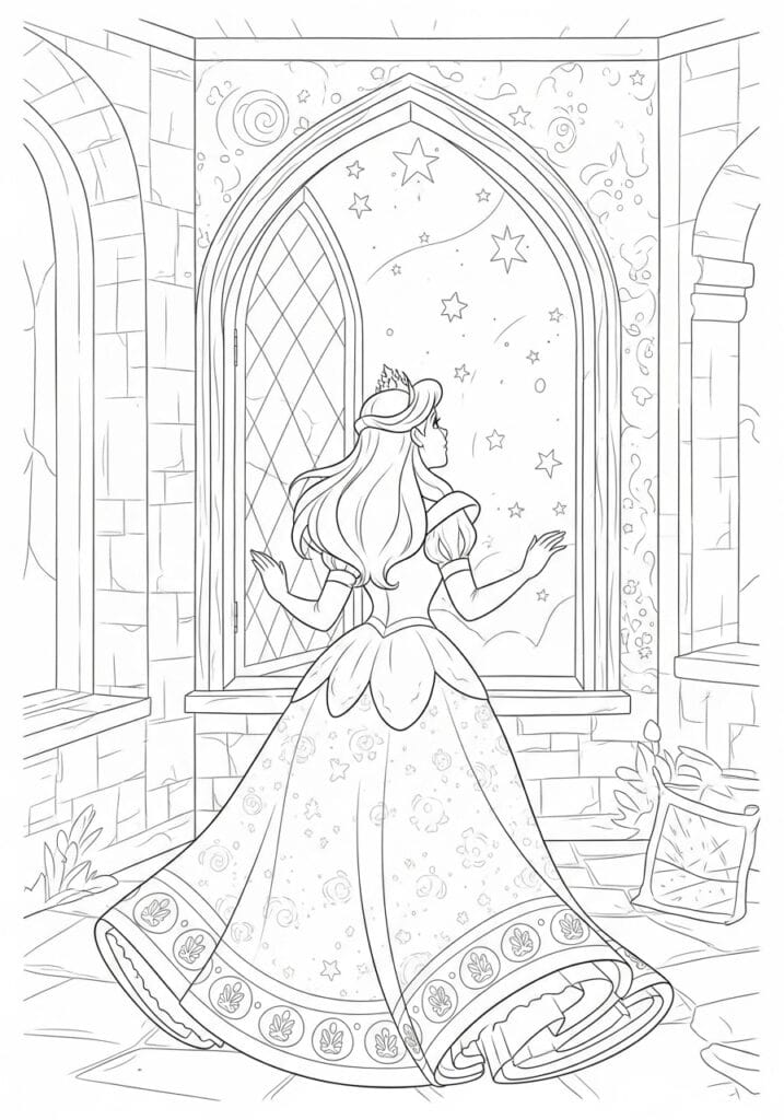 Something about a princess gazing at stars through a castle window just hits differently and I find this page genuinely moving to color in the best possible way. The gown is obviously where most of the color magic happens and I think a deep midnight blue scattered with tiny silver and gold star details would look absolutely spectacular against the warm stone walls. I would keep the starry sky outside the window in rich deep purples and indigos with bright white stars, making the whole scene feel like it exists right at that magical moment just before a wish gets granted.