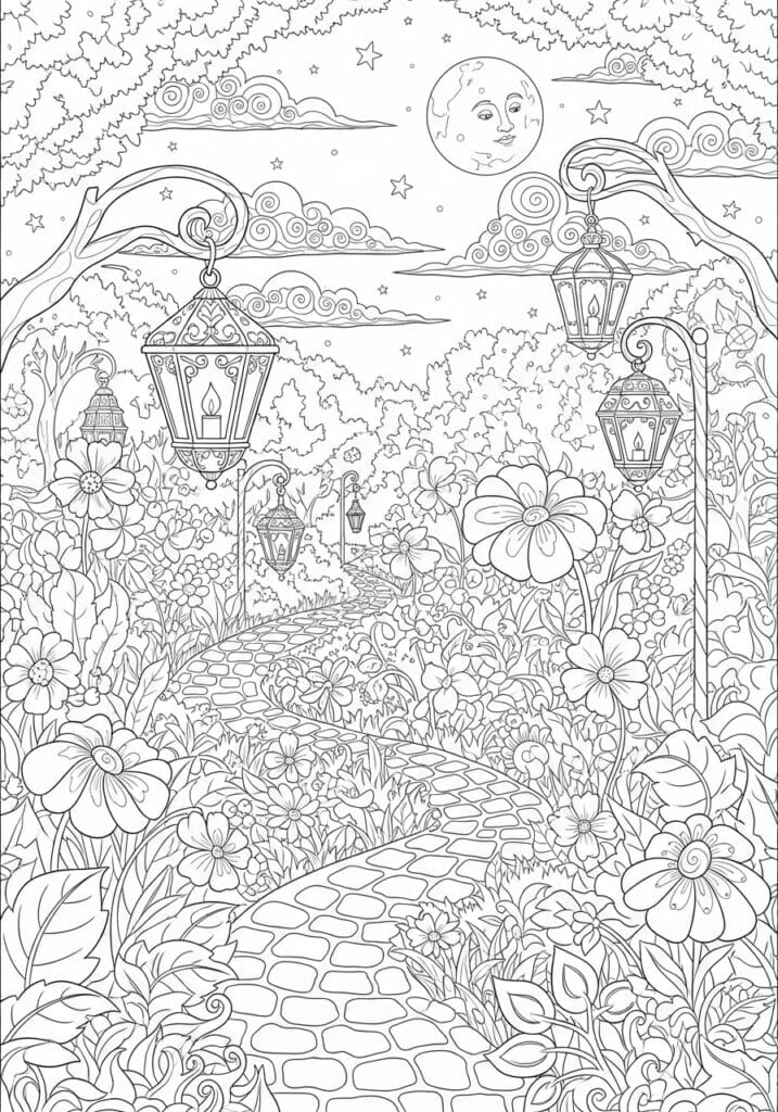 This is the kind of page I would describe as a coloring commitment and I mean that with the utmost affection and excitement. There is genuinely so much to color here that you could easily spend multiple evenings on it and still find new little details to appreciate. I would approach it garden section by section, working through the flowers in a mix of jewel toned purples, pinks, and warm corals, with the lanterns done in warm amber gold to really make them feel like they are actually glowing against a deep midnight blue sky. It is lush, magical, and completely wonderful.