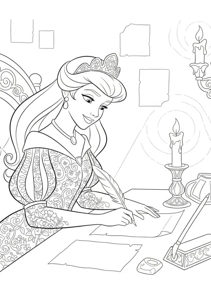This page has such a warm and intimate feel to it and I love how it captures a princess in a genuinely relatable quiet moment. Cinderella is leaning forward at a writing desk with a feather quill in hand, a smile playing on her lips as she works on what looks like an important letter, with loose parchment pages scattered across the desk in front of her. Her gown is absolutely stunning and packed with the most intricate scrolling floral and leaf patterns that cover the bodice and sleeves in gorgeous repeating detail, making it one of those dresses you could happily color for a very long time. A decorative wall sconce and a tall dripping candle on an ornate candlestick holder illuminate the scene from the right side, casting that lovely warm intimate glow over everything. Behind her you can just make out the curved back of an elegantly scrolled chair and what appear to be framed pictures on the wall, adding a nice sense of depth and domestic coziness to the royal setting. The line work is clean and characterful with beautifully detailed pattern work on the dress and decorative objects.