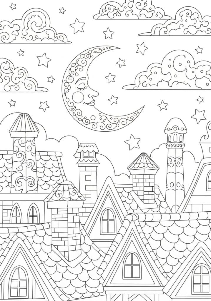 I find this page so deeply relaxing because it has such a clear and natural division between the detailed rooftop section below and the more open airy sky above, which makes it really easy to approach in stages without ever feeling overwhelmed. The rooftile patterns are genuinely one of my favorite things to color because they have that lovely repetitive rhythm that just puts your brain into a really peaceful meditative state. I would go for warm terracotta and dusty slate tones on the rooftops, a deep velvety navy for the sky, and a soft glowing gold on that beautiful crescent moon to make the whole scene feel like the coziest little sleeping village imaginable.