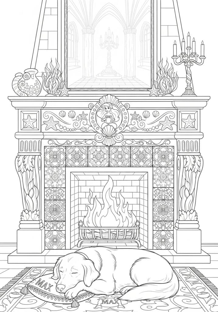 This page might just be the coziest thing I have ever seen turned into a coloring page, and that is saying a lot. The centerpiece is a stunning ornate fireplace absolutely loaded with Little Mermaid details, including scallop shells, starfish, seaweed motifs, and a gorgeous cameo of Ariel herself right in the middle of the mantel. The decorative tiles surrounding the firebox are filled with intricate floral and geometric patterns that are just chef’s kiss for anyone who loves detailed coloring. On the mantel sit a pretty shell vase and an elegant candelabra, and above it hangs a large mirror reflecting what looks like a grand candlelit hall. And curled up on a little personalized pillow right in front of the warm glowing fire is Max, Ariel’s adorable sleepy dog, which honestly makes the whole scene feel like pure magic.