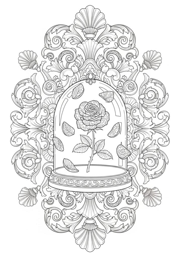 If there is one Disney image that has lived rent free in my head since childhood, it is absolutely this one. The design features the iconic enchanted rose sitting under its glass bell jar, with falling petals and tiny butterflies floating around it inside the dome. The rose itself is beautifully detailed with swirling petal patterns that make it look almost like a mandala, which I am completely here for. What really takes this page to the next level though is the absolutely breathtaking baroque frame surrounding the whole scene, filled with rolling acanthus scrolls, decorative shell motifs, and layered ornamental flourishes that spread all the way to the edges of the page. The line work is confident and detailed throughout, with a satisfying mix of bold outlines on the larger shapes and incredibly fine detail work inside the scrollwork and on the rose petals.