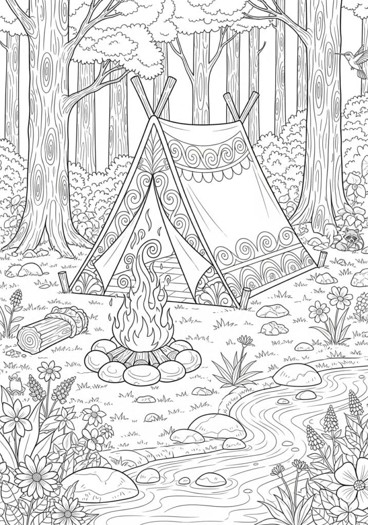 This page has such a warm and adventurous feel to it and I honestly think it deserves its own cozy night dedicated to coloring it properly. The star of the scene is an adorable A-frame tent decorated with the most charming swirling scroll patterns and leaf motifs along its edges, giving it a really whimsical folk art kind of vibe. Right in front of the tent sits a crackling campfire surrounded by smooth rounded stones, with a fallen log nearby just waiting for a camper to sit down. The whole scene is set deep in a lush forest with beautifully textured tree trunks filling the background, and a gentle winding stream flows through the foreground past wildflowers, rocks, and little clusters of grass. If you look closely you will also spot a tiny raccoon peeking out from behind the tent on the right side and a hummingbird hovering near the treetops, which are the kind of sweet little details that make a coloring page feel truly special. The line work is clean and well balanced, with bolder outlines on the main elements and softer finer detail in the foliage and water.