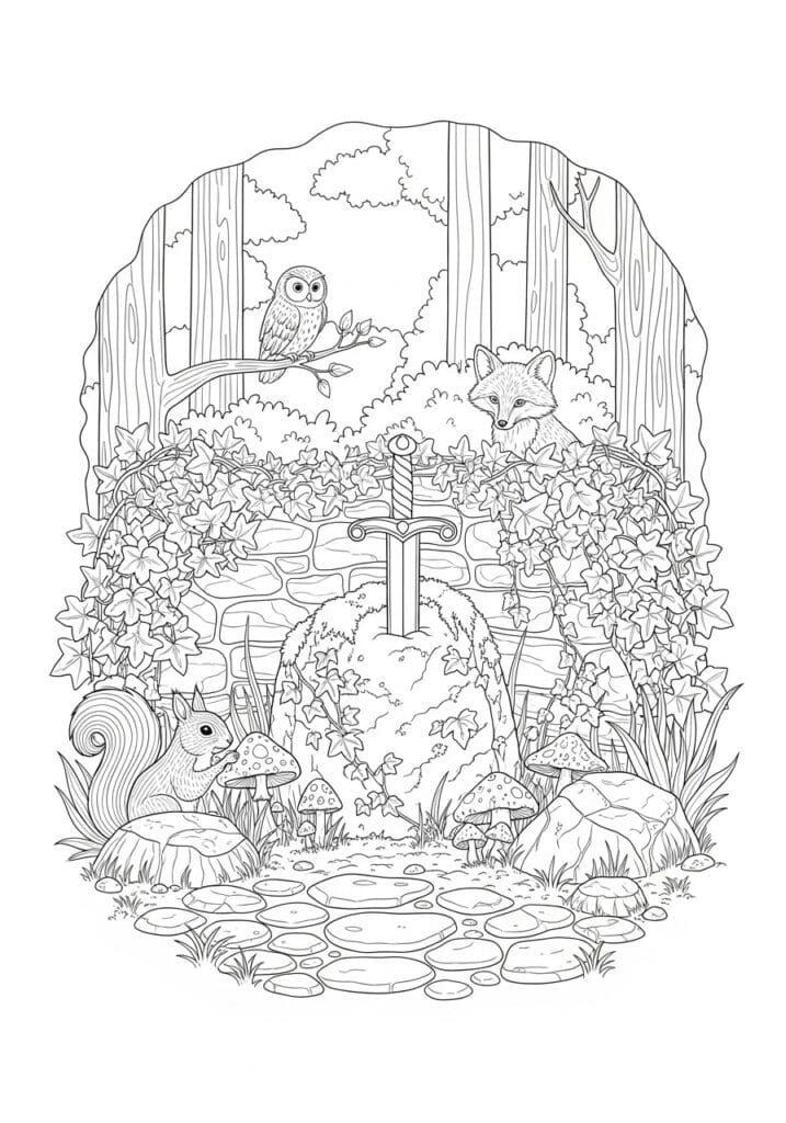 Pages like this one are genuinely my happy place and I think anyone who loves nature scenes and hidden detail is going to feel exactly the same way. There is so much to discover as you color through it, from those sweet little mushrooms dotted around the base to the tiny leaves trailing along the stone wall. I would love to color this one in rich autumn tones with deep russet oranges for the fox, warm mossy greens throughout the foliage, and a soft silvery blue for the sword to make it feel truly legendary. The whole scene has this peaceful secretive atmosphere that makes sitting down to color it feel like a little escape from the real world.