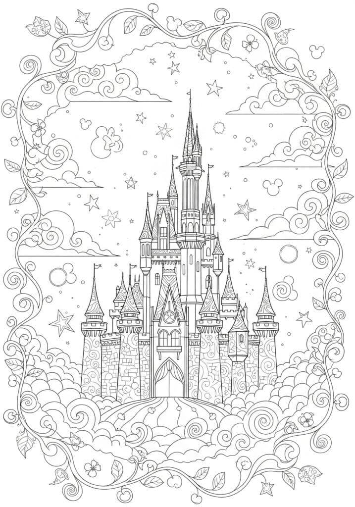 This page is pure Disney magic distilled into one absolutely stunning design and I am not even slightly exaggerating. The iconic Cinderella Castle sits front and center in all its towering spired glory, rendered with gorgeous architectural detail including arched windows, stone texture, decorative turrets, and tiny flags at every peak. The castle appears to float on billowing swirling clouds that fill the lower portion of the page with beautiful rolling scroll shapes, giving the whole scene a dreamy elevated feel. A starry sky surrounds the upper castle with scattered stars of different sizes, and the entire composition is framed by the most gorgeous trailing vine border decorated with leaves, small flowers, and the sweetest hidden Mickey shapes tucked throughout if you look closely enough. The line work shifts beautifully between fine architectural detail on the castle itself and looser flowing organic curves in the clouds and vine border, making the whole page feel dynamic and full of life.