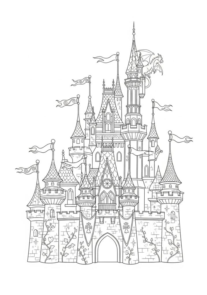 This coloring page features an incredibly detailed fantasy castle straight out of a storybook dream. The design is packed with pointed spires, scalloped roof tiles, arched gothic windows, flowing banners, and intricate brickwork across every tower. Climbing vines and floral motifs wind their way up the lower turrets, while sparkle details are scattered throughout the walls for a touch of magic. The line work is clean and confident, with a good mix of bold outlines and finer interior details that give the whole page a beautifully balanced, almost ornate feel. And the little dragon perched on the tallest tower? Absolutely iconic.