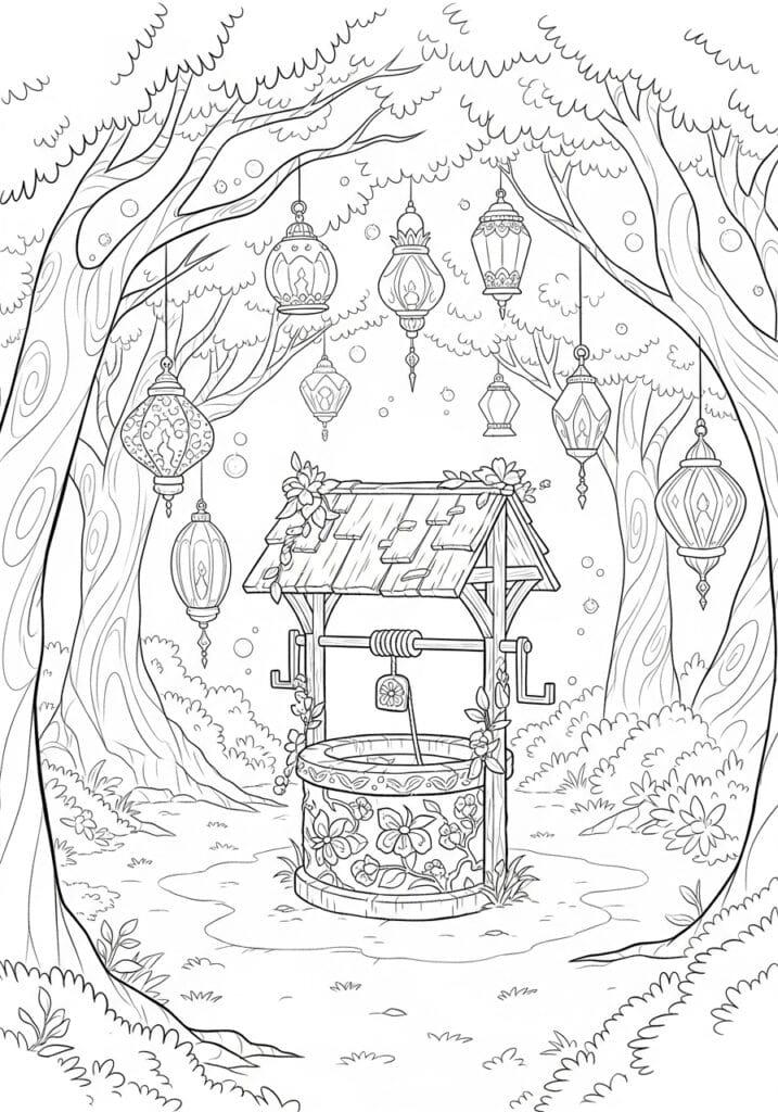 This coloring page is an absolute dream of a scene, centered around a beautifully detailed stone wishing well sitting in the heart of a glowing enchanted forest. The well itself is decorated with carved floral motifs around its base and topped with a rustic wooden roof draped in climbing vines and tiny blossoms. What really makes this page special though is the collection of ornate hanging lanterns dangling from the tree branches above, each one unique in shape with intricate geometric and decorative patterning that ranges from diamond lattice to oval filigree designs. The framing trees on either side have wonderfully textured swirling bark, and the whole scene is softened by rounded bushes, scattered ground plants, and floating bubbles drifting through the air. The linework shifts beautifully between bold structural outlines and delicate fine details, especially on the lanterns.