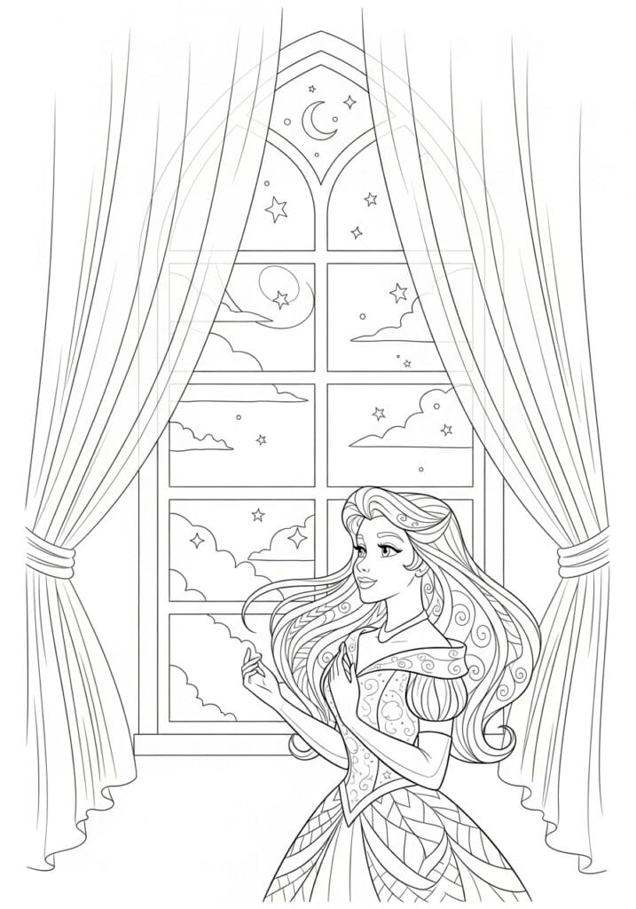 There is something about this page that just feels deeply cinematic and I am absolutely here for it. The night sky through those window panes is my favorite part to color because you can build up the most gorgeous deep blue to purple gradient and then go back in with a white gel pen to make the stars and moon really pop. I love keeping the curtains in a rich jewel tone like deep burgundy or forest green to contrast with the cool sky behind them. And the princess’s dress with its swirling details and lattice skirt is genuinely so fun to color with something unexpected like a dusty rose or a soft sage green. The whole finished piece looks like a scene from a movie.