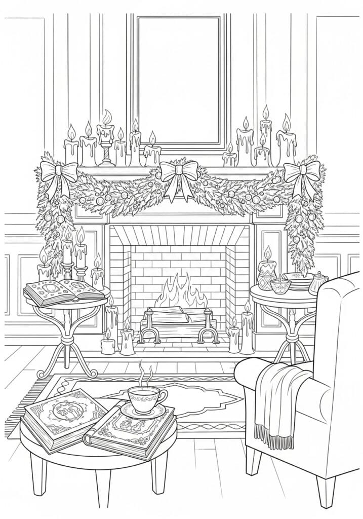 This coloring page is the definition of festive hygge and every single detail adds to that warm holiday magic. A grand brick fireplace takes center stage with a crackling fire burning inside, flanked by tall dripping candles on ornate stands and surrounded by the most gorgeous garland draped across the mantelpiece, complete with baubles, pine sprigs, and three large decorative bows. More candles of varying heights line the mantel shelf above, and mini Christmas trees decorated with ornaments tuck in on either side. In the foreground a low coffee table holds a steaming cup of tea and a stack of beautifully decorated storybooks, an armchair with a cozy draped blanket sits to the right, and a second side table with an open book and more candles fills the left. The linework is clean and well structured with lots of lovely texture detail in the brickwork, wood flooring, and fabric elements.