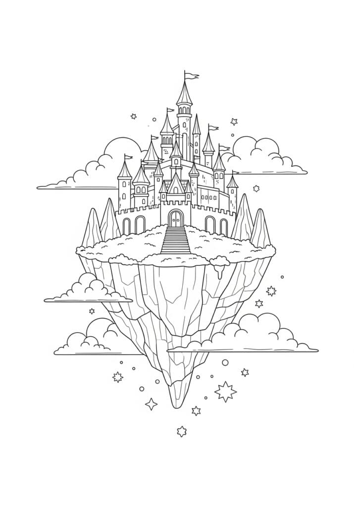 This page is such a fun creative challenge because the concept itself is so open to interpretation and that gives you a lot of freedom to go in a totally unexpected direction with your color choices. I personally love making the rocky island underneath look like it is made of something otherworldly, like going for a deep teal and violet with lighter facets to make it look almost crystalline rather than just grey stone. The castle I like to keep soft and pale against a dreamy pastel sky so it really feels like it is floating rather than solid and heavy. The contrast between the two textures makes the finished piece look genuinely spectacular.
