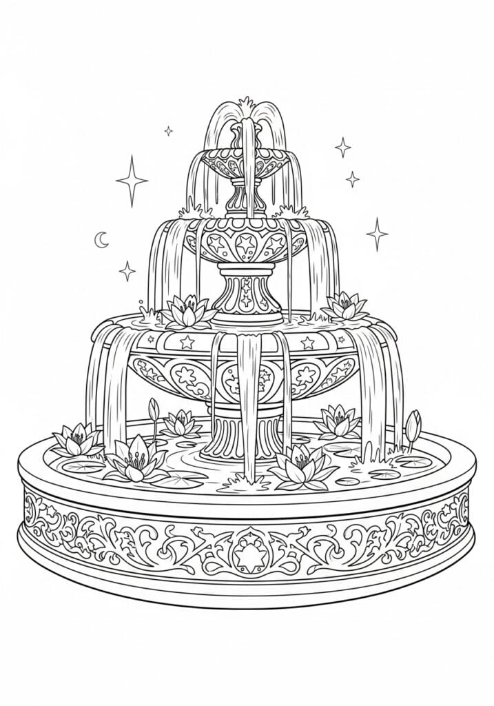 This coloring page is a stunning standalone centerpiece design featuring a grand three-tiered decorative fountain sitting against a clean white background scattered with four-pointed stars and a delicate crescent moon. Each tier of the fountain is more ornate than the last, with cascading water drawn in lovely flowing vertical lines that arc and tumble gracefully from one level to the next. The middle tier features star motifs and scrollwork panels, while the top basin is decorated with intricate filigree-style detailing. The wide circular base pool is dotted with beautiful water lily flowers and lily pad leaves floating on the surface, adding a gorgeous natural softness to all that architectural grandeur. The outer rim of the base is covered in the most detailed repeating acanthus leaf and scroll pattern that really anchors the whole design. The linework is beautifully varied, shifting between bold structural outlines and incredibly fine decorative detailing throughout.