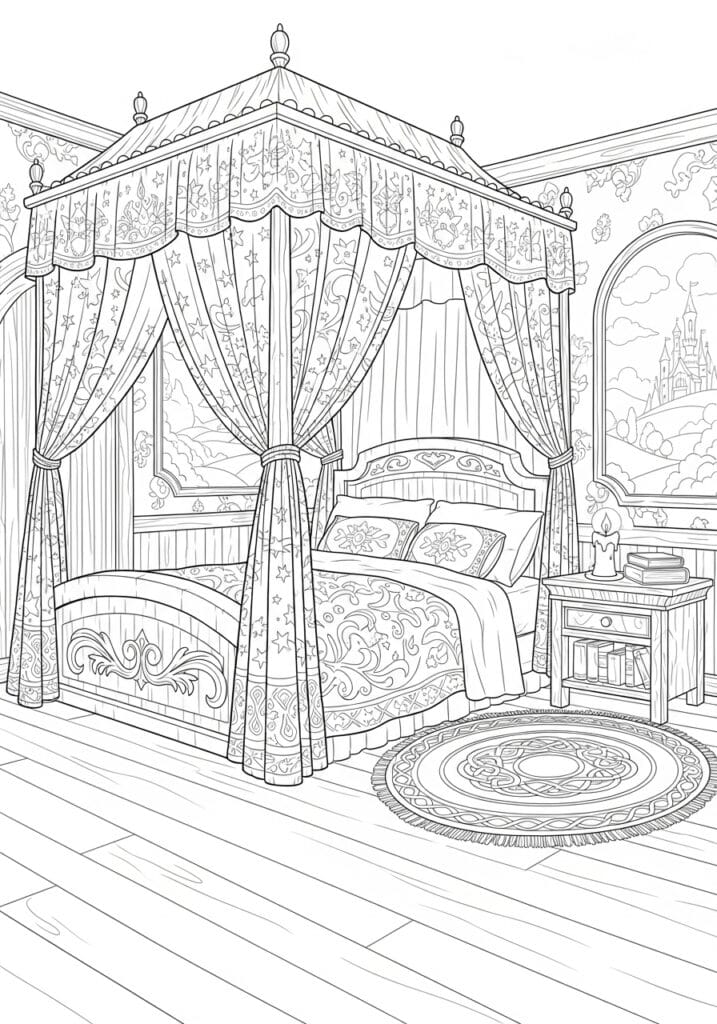 I honestly think this might be the most satisfying page in the entire collection to color and I say that with full confidence. There is so much going on with the fabric patterns alone that you could spend a whole session just on the canopy curtains, building up the star and vine details in soft purples, deep jewel tones, or even a romantic dusty rose. I love going warm and golden on the wooden furniture and floor to create that candlelit glow, and the round rug in the foreground is such a fun little mandala project all on its own. The glimpse of the castle through the window is the sweetest finishing touch to bring in that Disney magic.