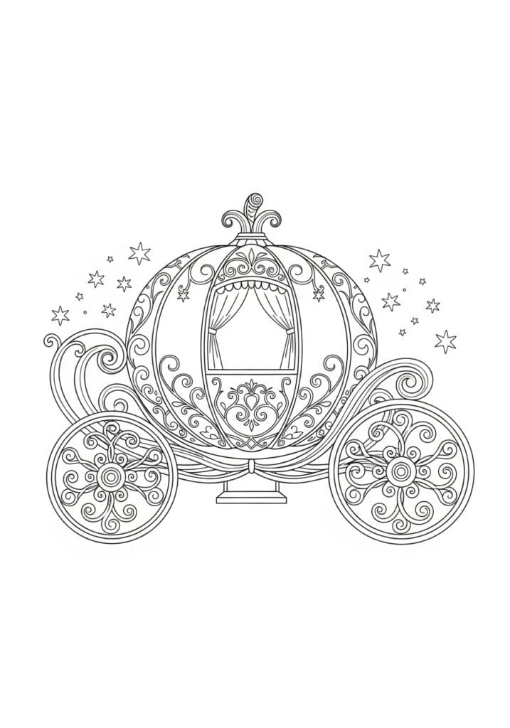 This coloring page is the most iconic Disney image rendered in the most gorgeous ornamental style, and it is an absolute treat from top to bottom. The classic pumpkin carriage sits centered on a clean white background, its round body covered in the most beautiful flowing scrollwork, curling vines, and filigree detailing that fills every section of the carriage exterior. A small arched window with draped curtains sits at the center, framed by an elegant canopy valance, and a decorative fleur-de-lis style finial tops the whole carriage off at the peak. The two large wheels on either side are equally ornate with circular rosette patterns and matching scroll spokes, and loose swirling flourishes extend outward from the base of the carriage like trails of magic. Stars of varying sizes float around the whole composition on both sides, giving it that unmistakable fairy godmother magic dust energy. The linework is bold, clean, and satisfyingly symmetrical throughout.