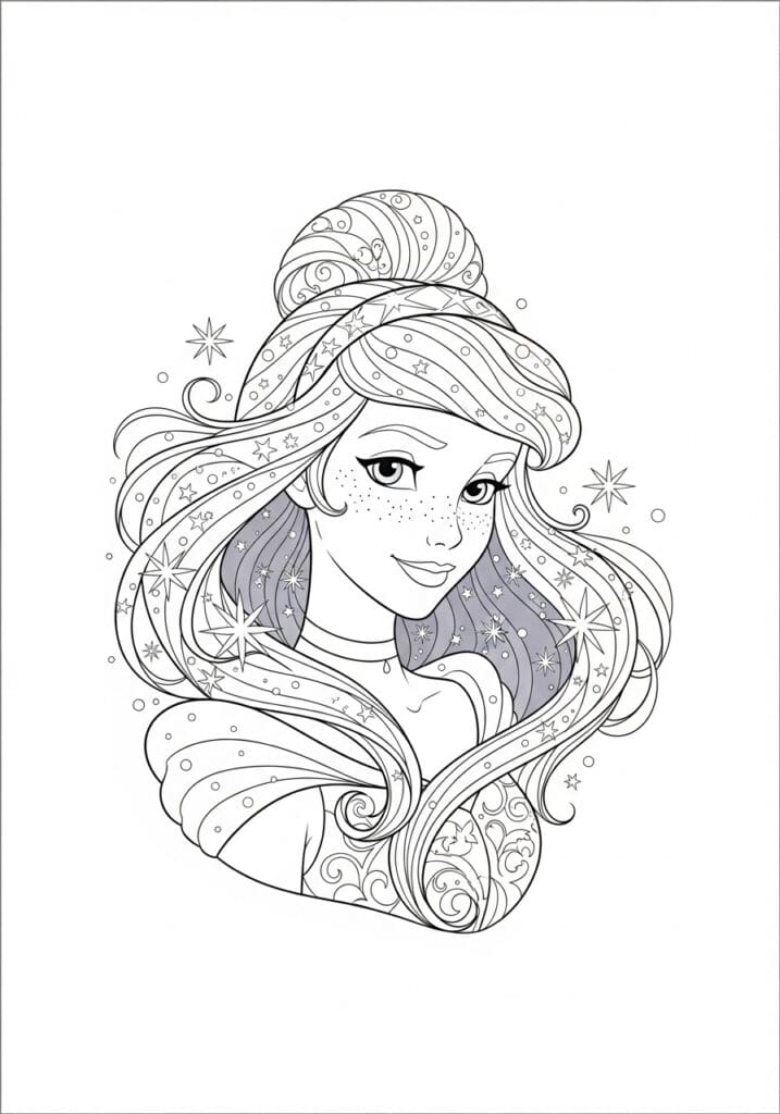 This gorgeous coloring page centers on a close-up portrait of a Disney-style princess with long flowing hair swept up into an elegant bun, with loose waves tumbling down around her shoulders. Her hair is filled with the most beautiful fine-line details including swirling strands, scattered stars, tiny circles, and delicate sparkle bursts that float around her like magic dust. She has the sweetest freckles across her nose and a soft, confident expression that just draws you in. Her clothing features lovely scrollwork and curl motifs, and the whole composition sits on a clean white background that keeps the focus entirely on her ethereal, fairy-tale energy. The line work is smooth and refined with bold outlines on the figure and lighter, more intricate linework in the hair and decorative details.