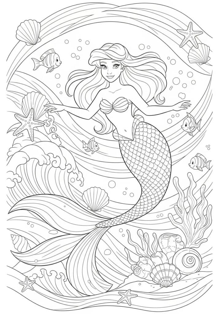 This coloring page is an absolute feast for the eyes and fills the entire page from edge to edge with underwater magic. A beautiful mermaid with long flowing hair takes center stage, her detailed scalloped tail curling gracefully as she glides through the water surrounded by tropical fish, starfish, seashells, swirling seaweed, and clusters of bubbles. The background is made up of sweeping curved lines that create a sense of ocean current and movement, giving the whole composition a really dynamic and alive feeling. There are so many gorgeous little details tucked into every corner, from a spiral conch shell at the bottom to ornate clam shells along the sides, all rendered in clean medium-weight linework that is satisfying to color without being too fiddly.