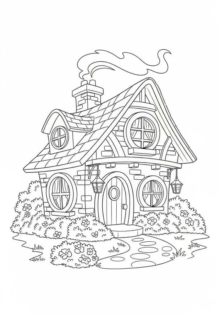 This charming coloring page features the most adorable hobbit-style cottage that looks like it was plucked straight out of a fairytale village. The little house has a dramatically curved roofline with detailed tile texturing, a brick chimney puffing out a wispy curl of smoke, and the sweetest round windows with cross pane details on both levels. Hanging lanterns flank the arched wooden front door, and the whole building sits on a sturdy stone foundation surrounded by fluffy rounded bushes, little wildflowers, and a winding stepping stone path that leads right up to the entrance. The linework is bold and chunky which makes it really approachable, while the texture details on the roof tiles, brickwork, and wooden door panels add just enough complexity to keep things interesting.