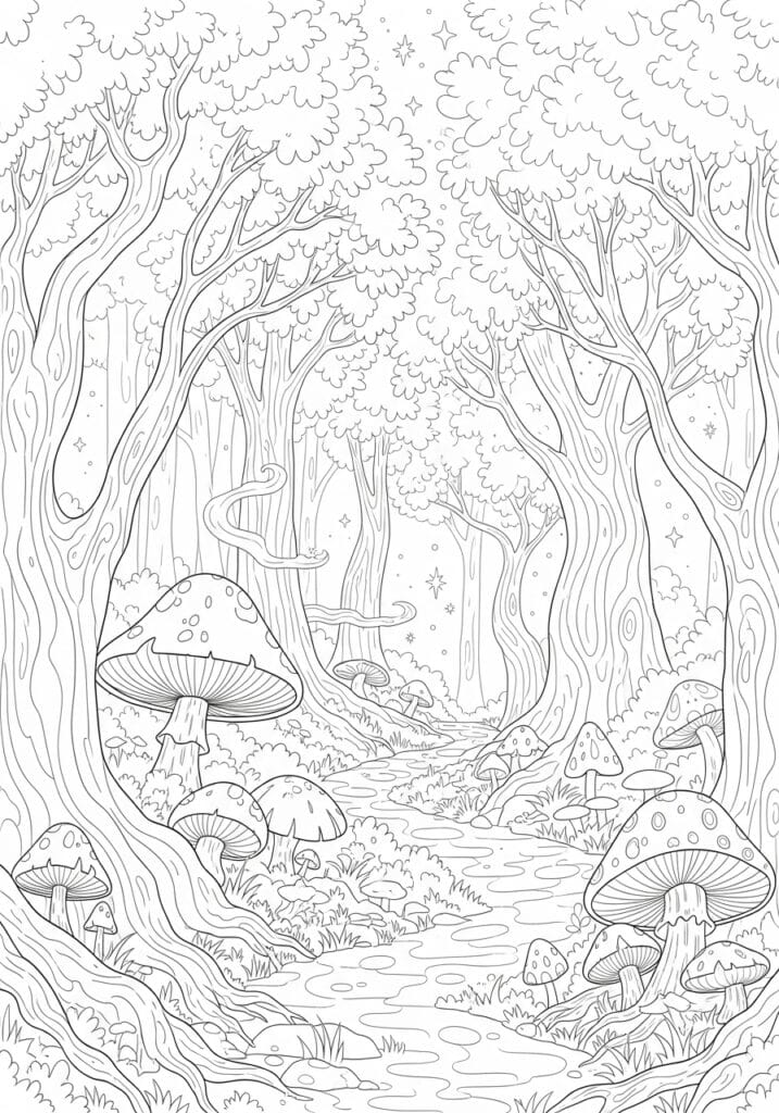 I am not exaggerating when I say this page is basically therapy in coloring page form. The tree bark sections alone are so rhythmic and repetitive to color that my brain just completely switches off in the best possible way. I love going deep and moody with this one using forest greens, warm ochres, and rich dark browns for the trees, then making the mushrooms pop with unexpected colors like coral red or burnt orange. The little star details are the cherry on top because adding a few dots of a white gel pen at the end transforms the whole thing into something that looks genuinely magical. This one is a keeper for sure.
