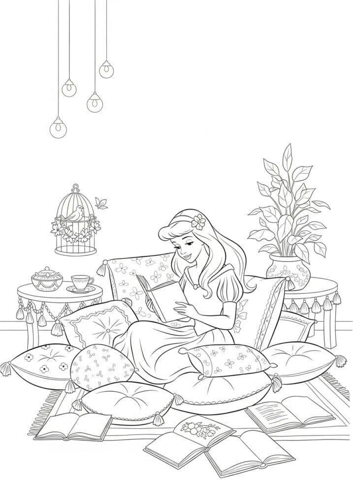 This page speaks to my soul on a deep personal level because it is basically a princess version of my ideal Saturday. I love how every single prop in this scene is its own little coloring opportunity, from the patterned cushion covers to the delicate teacup to the intricate little birdcage. I tend to go for warm, golden tones on this one to really lean into that cozy lamplight feeling, and coloring the hanging bulbs with a soft yellow glow makes the whole scene feel so inviting. It is the kind of page you color while actually sitting in your own cozy spot with a cup of tea, and that layered experience is just chef’s kiss.