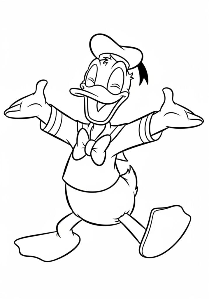 This coloring page captures Donald Duck in his signature look with that adorable sailor hat and bow tie, arms spread wide in his characteristic cheerful pose. The design features clean, bold outlines that make each section easy to identify, from his expressive face with those iconic half-closed eyes to the distinctive sailor outfit and oversized webbed feet. The line work is thick enough to guide your coloring tools smoothly while leaving plenty of open space within each area for your creative color choices.