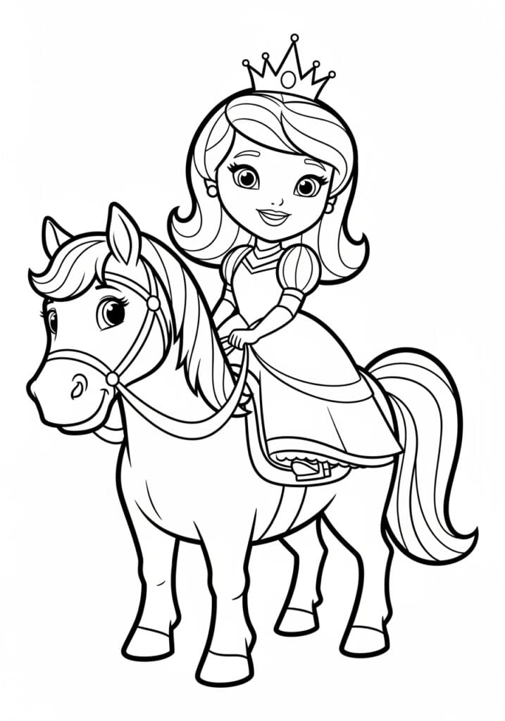 This coloring page captures Sofia the First riding her adorable horse in a sweet royal moment, complete with her signature tiara perched on top of her flowing hair. The design shows Sofia in her classic princess dress with puffed sleeves and a full skirt, sitting gracefully on her horse who has the most gentle expression with big expressive eyes and a lovely flowing mane and tail. The horse’s saddle and bridle are clearly detailed, and you can see Sofia’s hand holding the reins. Both characters have that charming Disney style with soft curves and friendly features that make them instantly recognizable. The line work is consistent and clean throughout, creating well-defined spaces perfect for filling with color.