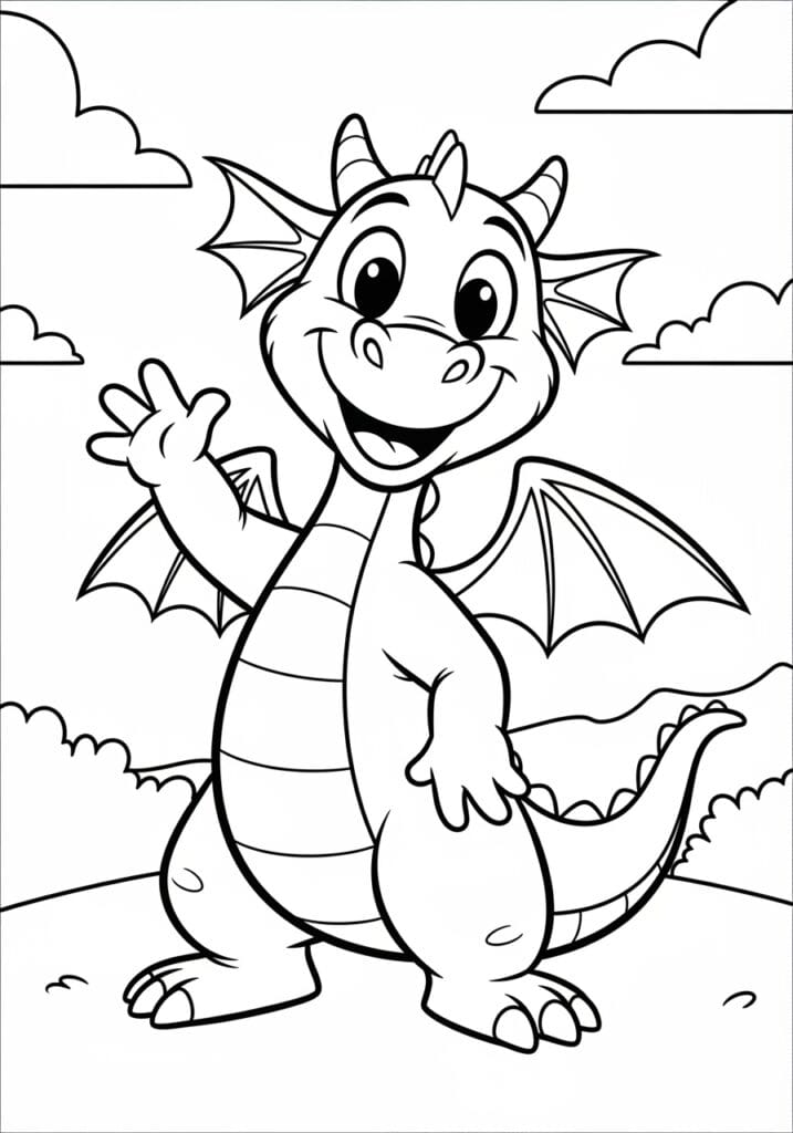 This coloring page features an absolutely adorable cartoon dragon with a big friendly smile, waving enthusiastically with one paw raised high. The design includes charming details like two little horns on top of his head, bat-like wings spread out on either side, a segmented belly running down his front, and a long curving tail with spikes along the back. The dragon stands in a simple outdoor setting with puffy clouds dotting the sky and small bushes on the ground, creating a complete scene without being too busy. The line work is wonderfully varied with thick outlines defining the main shapes and thinner lines adding personality through details like the wing membranes and those cute little claws.