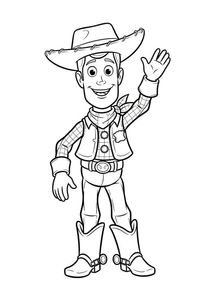 This coloring page shows Woody in a welcoming pose with one hand raised in a cheerful wave and that genuine smile that makes him such a beloved character. The design captures every detail of his classic cowboy outfit including the wide-brimmed hat with decorative stitching, the checkered pattern on his shirt sleeves and across his chest, the cowhide vest with pockets and circular buttons, his sheriff belt with the star buckle, fitted jeans with front pockets, and those iconic cowboy boots complete with spurs. His facial features are friendly and expressive with those big round eyes and open-mouthed grin. The line work varies nicely throughout with the checkered pattern providing visual interest through its repeating grid while the other elements use smooth, clean outlines.