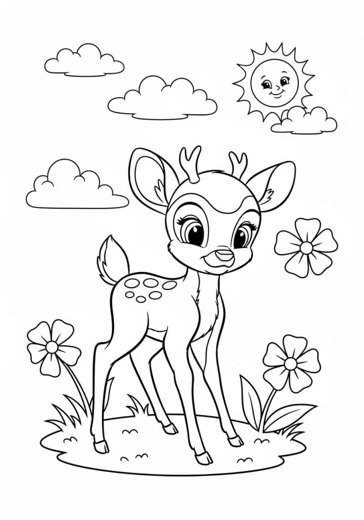 This coloring page features an adorable baby deer standing in a cheerful meadow scene complete with fluffy clouds, a smiling sun peeking through, scattered flowers, and tufts of grass. The little fawn has those characteristic spotted markings on its back, delicate antler buds just beginning to grow, large expressive eyes with long lashes, and slender legs that capture that sweet awkward grace of a young deer. The scene is thoughtfully composed with the deer as the central focus while the background elements like the simple flowers with their round centers and the puffy clouds create a complete outdoor setting. The line work is clean and friendly with smooth curves defining the deer’s gentle features and bolder outlines keeping everything easy to distinguish.