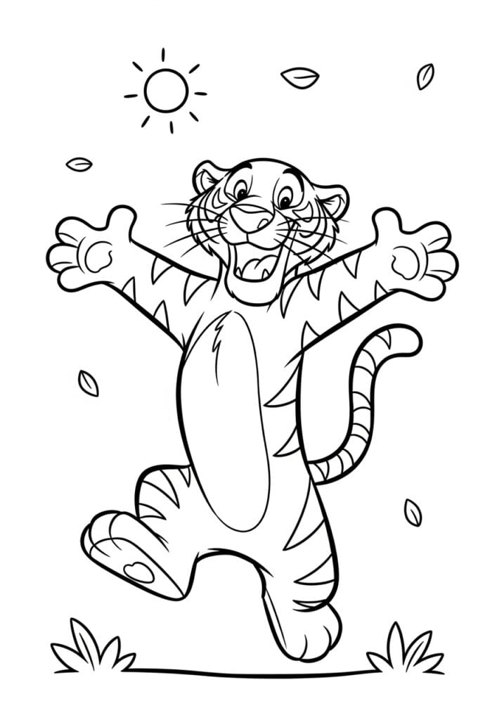 This coloring page captures Tigger in pure energetic bliss, jumping with his arms spread wide and that huge enthusiastic grin on his face. The design showcases his distinctive features including those bold tiger stripes across his body and tail, fluffy cheeks with whiskers, rounded ears, and oversized paws with visible toe pads. The background is kept simple but playful with a bright sun in the corner, a few floating leaves, some grass tufts at the bottom, and a ground line suggesting he’s mid-bounce. The line work is dynamic with zigzag patterns defining his stripes and smooth curves capturing his bouncy movement and joyful expression.