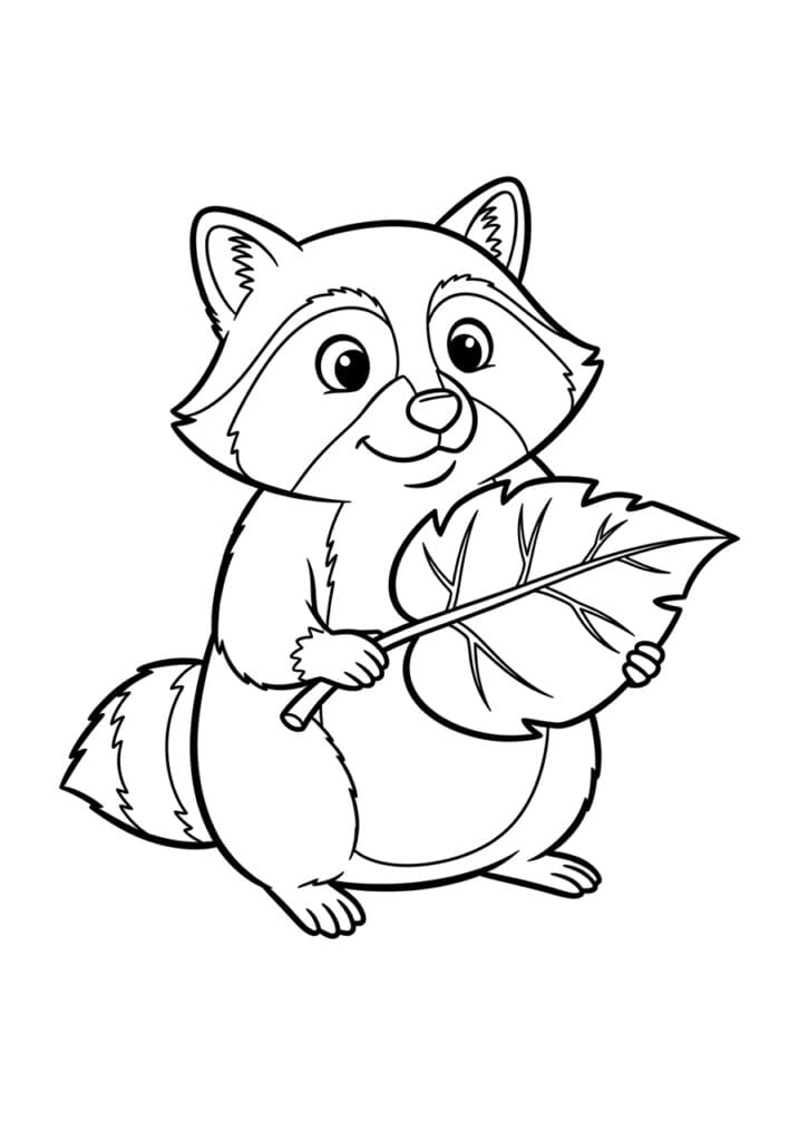 This coloring page features Meeko from Pocahontas in an adorable pose, sitting upright while holding a large leaf in his little paws. The design captures his playful personality with those big expressive eyes, cute button nose, and that signature raccoon mask marking across his face. His fluffy tail curves behind him with subtle striping indicated through line work, and his rounded ears stand alert with detailed inner ear markings. The leaf he’s holding has beautiful veining details that create natural sections perfect for coloring. Zigzag lines along the edges of his body suggest soft fur texture, and his tiny paws with their finger details add an endearing touch. The line work maintains good consistency with clean outlines that make every feature easy to distinguish.