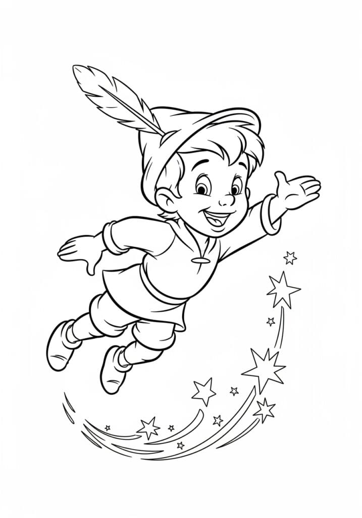 This coloring page captures Peter Pan in full flight with his arms spread wide and that mischievous grin on his face, looking absolutely carefree and adventurous. The design shows him in his classic outfit with the tunic, collar, belt, tights, and those distinctive pointed shoes, plus his iconic feathered cap perched jauntily on his head. The background brings the magic to life with shooting stars trailing across the space, creating those beautiful arcing paths that suggest movement and speed. His hair has that wind-swept look with flowing strands that add to the sense of motion. The line work is energetic and expressive, with clean outlines defining his figure and delicate curved lines creating the star trails.