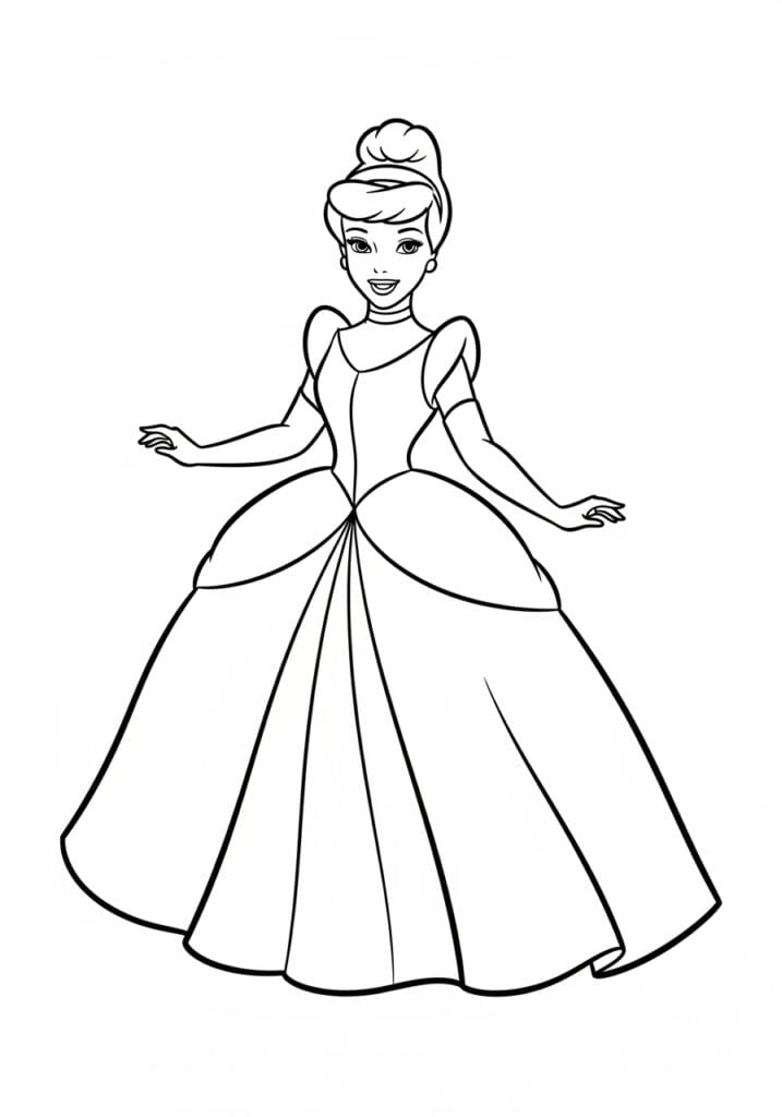 This coloring page showcases Cinderella in her most memorable moment, wearing that stunning ball gown with its voluminous skirt flowing in elegant panels. The design captures her graceful pose with outstretched arms and that classic updo hairstyle with the signature bun. Her facial features are delicately drawn with a gentle smile and those expressive eyes that radiate kindness. The gown itself is divided into beautiful sections with the fitted bodice, puffed sleeves, and the dramatic full skirt that creates such a regal silhouette. The line work is clean and consistent throughout, giving you well-defined areas to work with.