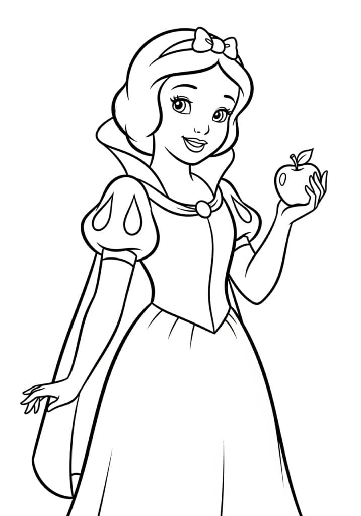 I really enjoy coloring this page because it brings together so many different textures and elements to play with. Those puffed sleeves are perfect for adding dimension with lighter and darker shades, and you can have fun deciding whether to make the apple green or go with the traditional poisoned red. The hair offers a great opportunity to practice creating depth and flow with your coloring technique. Something about this design just feels wholesome and nostalgic, and I find it super relaxing to work on when I want to revisit a classic Disney moment. The balance between detailed areas like the face and simpler spaces like the skirt makes it enjoyable no matter how much time you have to spend on it.