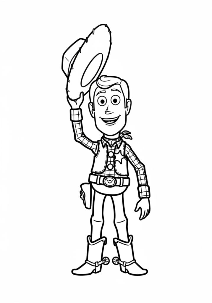This coloring page features Woody in his classic enthusiastic pose with one arm raised high holding his cowboy hat and that signature friendly grin on his face. The design captures all the iconic details of his sheriff outfit including the checkered pattern on his shirt sleeves, the cowhide vest with decorative stitching, his belt buckle with the star badge, fitted jeans, and those cowboy boots complete with spurs. His hair has that trademark swoop, and his facial expression radiates pure joy and friendliness. The line work varies nicely between the finer details like the checker pattern and the bolder outlines that define his overall shape.