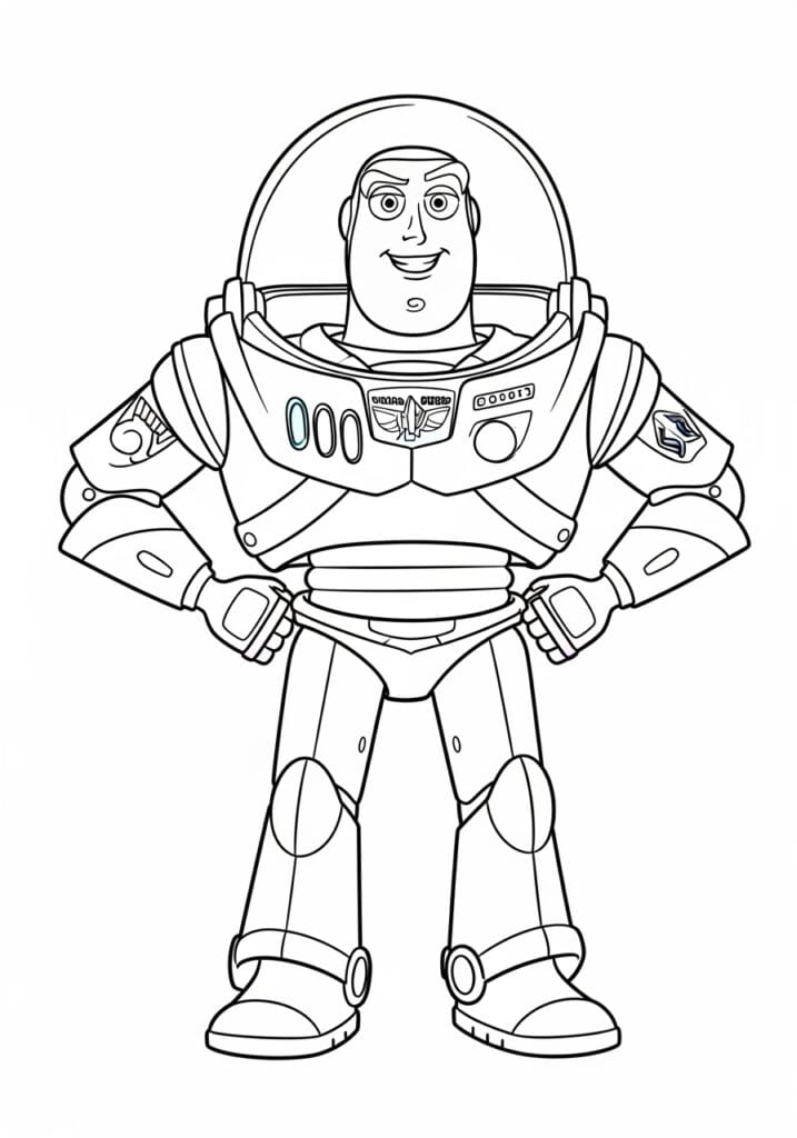 This coloring page showcases Buzz Lightyear in his confident superhero pose with hands on hips and that determined smile on his face. The design is packed with details from his iconic space ranger suit including the dome helmet, the chest plate with its control panel and buttons, the layered armor pieces on his arms and legs, and those characteristic boot designs. You can see all the mechanical elements like the circular joints at his knees, the various panels and segments that make up his suit, and even tiny details like the wing buttons on his chest. The line work is clean and well-defined, making each component of his elaborate costume easy to distinguish.
