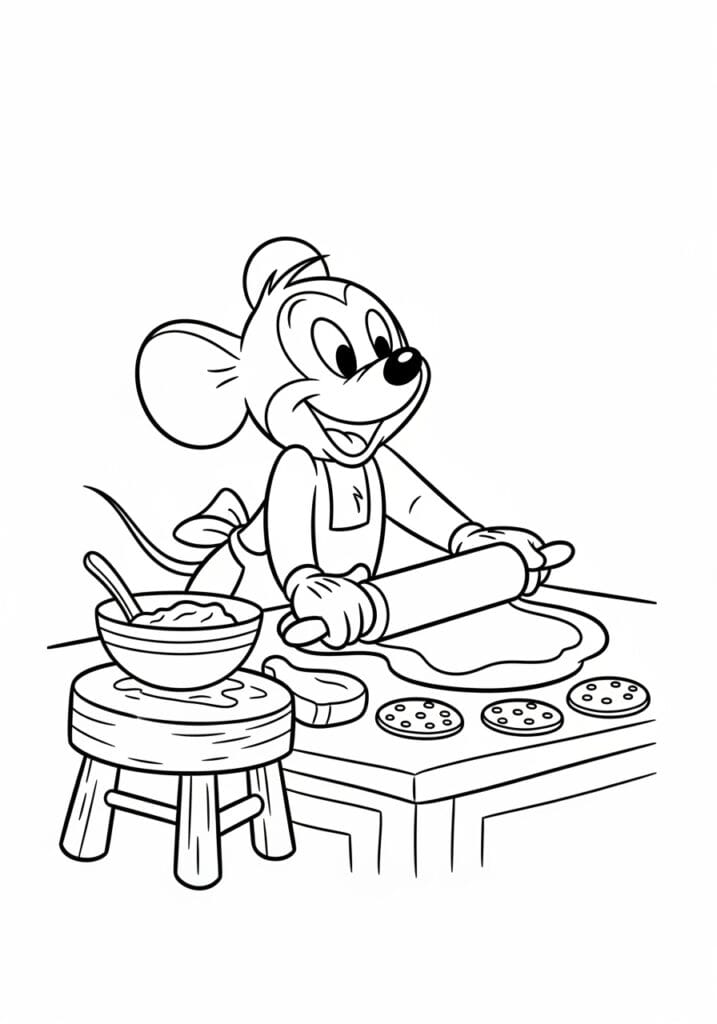 This coloring page shows Mickey Mouse in an adorable baking scene, rolling out cookie dough on a countertop with chocolate chip cookies already laid out beside him. The design includes Mickey wearing his chef’s hat and apron, his characteristic round ears and that cheerful smile that makes him so lovable. The scene is filled with delightful details like the mixing bowl on a wooden stool, a spoon, measuring cup, the wood grain texture on both the stool and countertop, and those perfectly round cookies with their chocolate chips. The composition creates a cozy kitchen moment with Mickey positioned slightly to the left, giving the scene a natural, candid feel. The line work is friendly and accessible with clear outlines that make each element easy to identify and color.