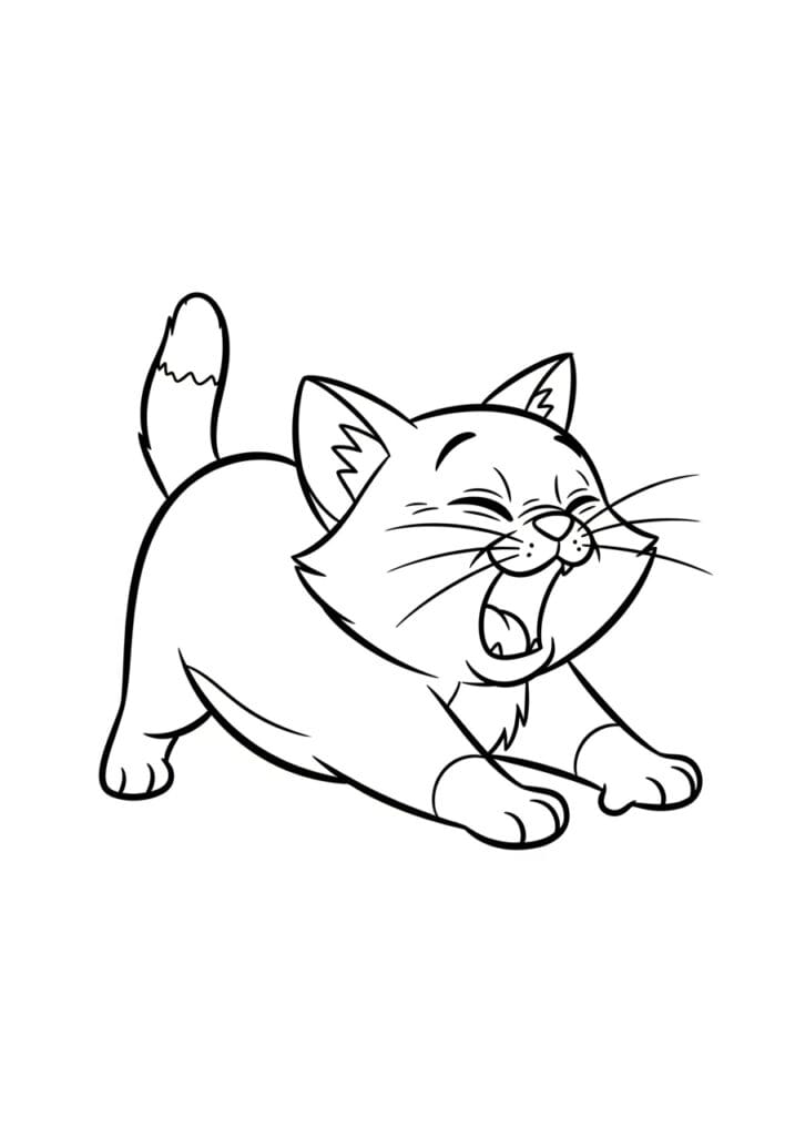 This coloring page captures a super expressive little kitten in the middle of the most dramatic morning stretch you have ever seen, front paws splayed forward, bottom up in the air, tail curling up behind, and mouth wide open in a big loud yawn that you can practically hear through the page. Long wispy whiskers shoot out from either side of her face, her eyes are scrunched shut in that blissful way cats have when they are completely in their own world, and little tufts of fur texture are suggested with small jagged lines inside the ears and around the chin. The line work is bold and fluid, following the natural curves of the cat’s stretching body beautifully, and the whole composition is placed diagonally across the page which gives it this wonderful sense of spontaneous movement and personality.